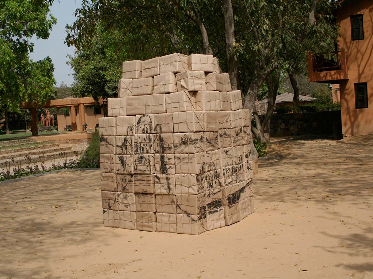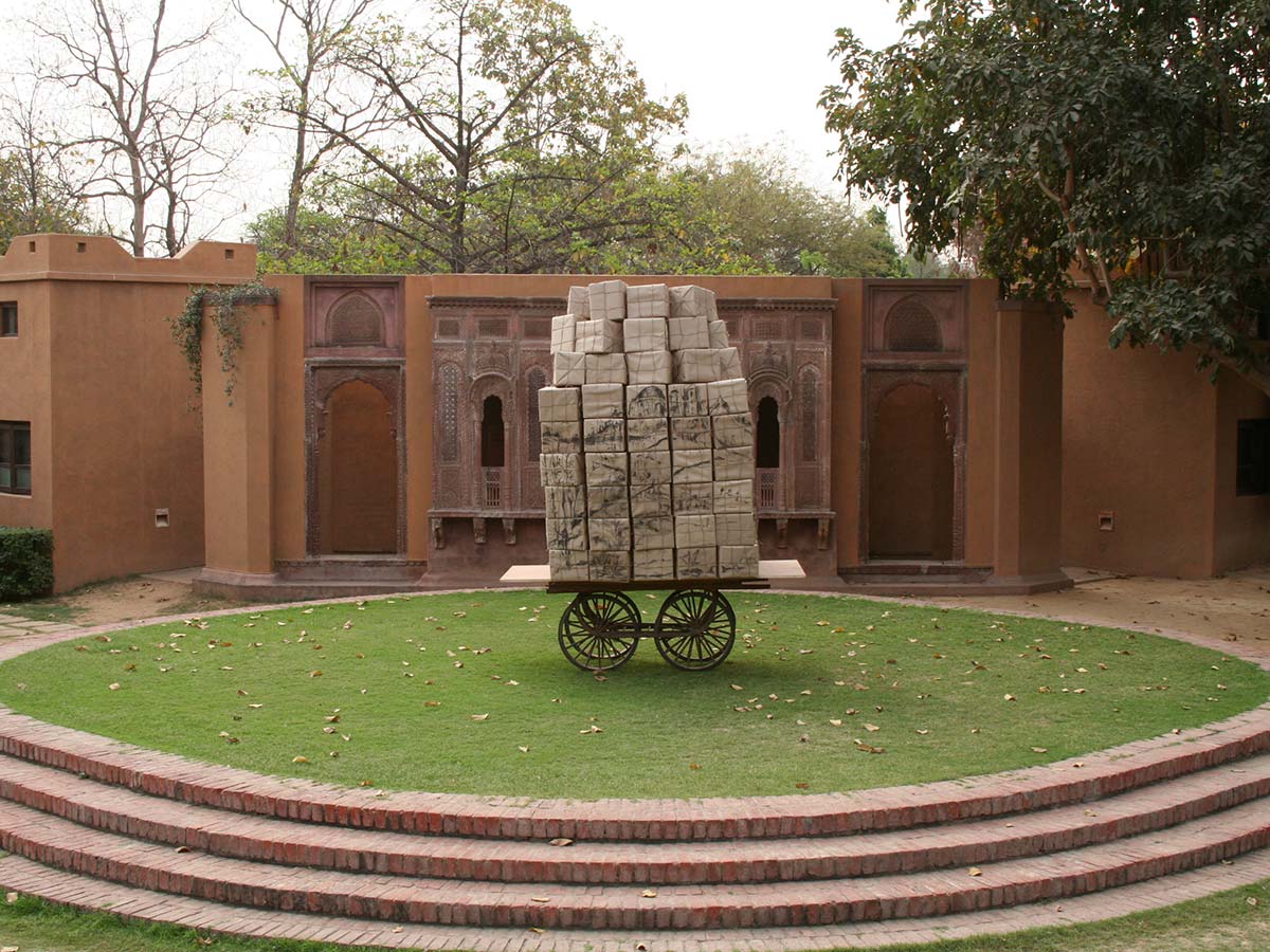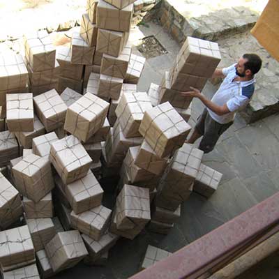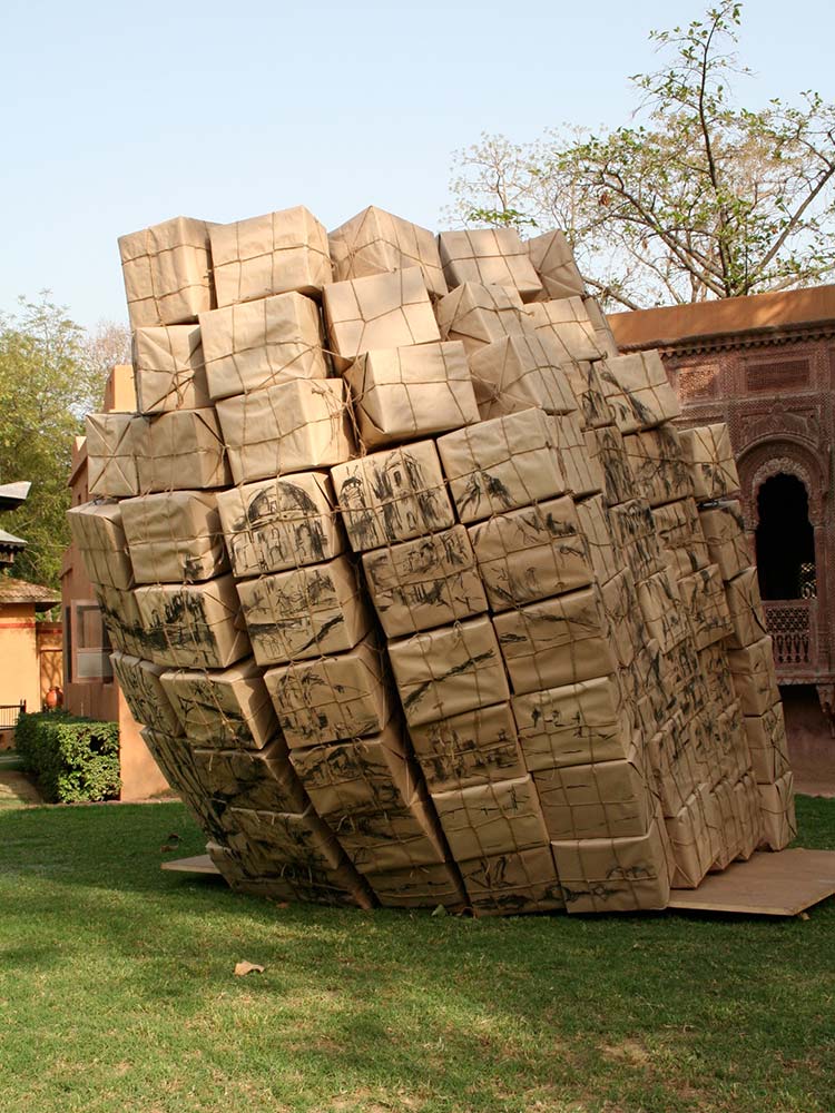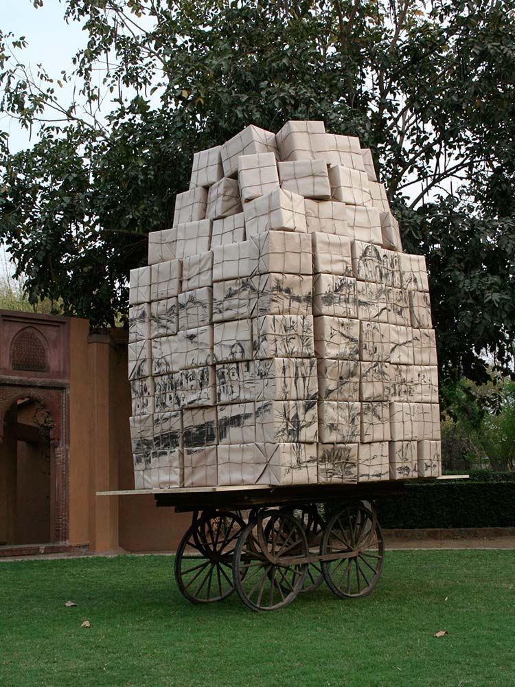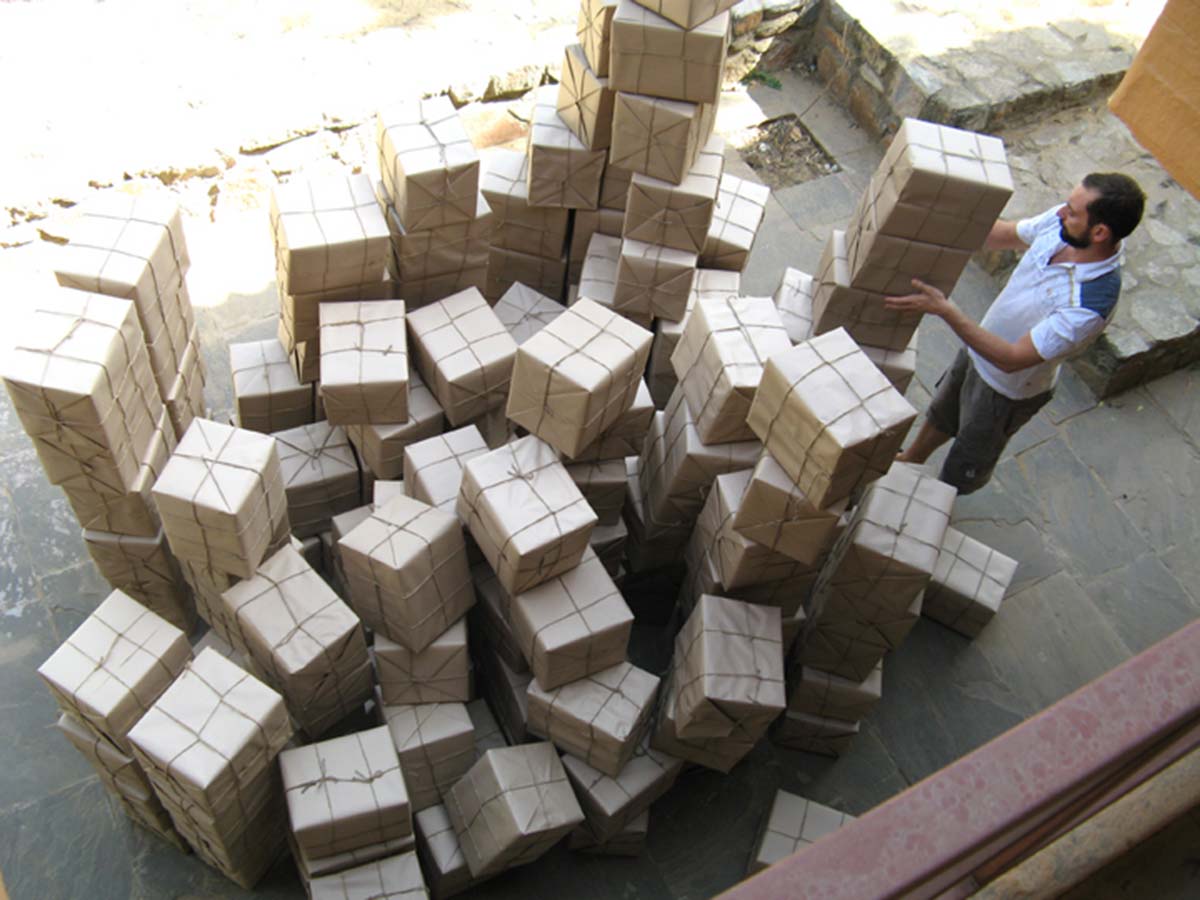 What We Carry With Us Cardboard boxes, brown paper, twine, cart