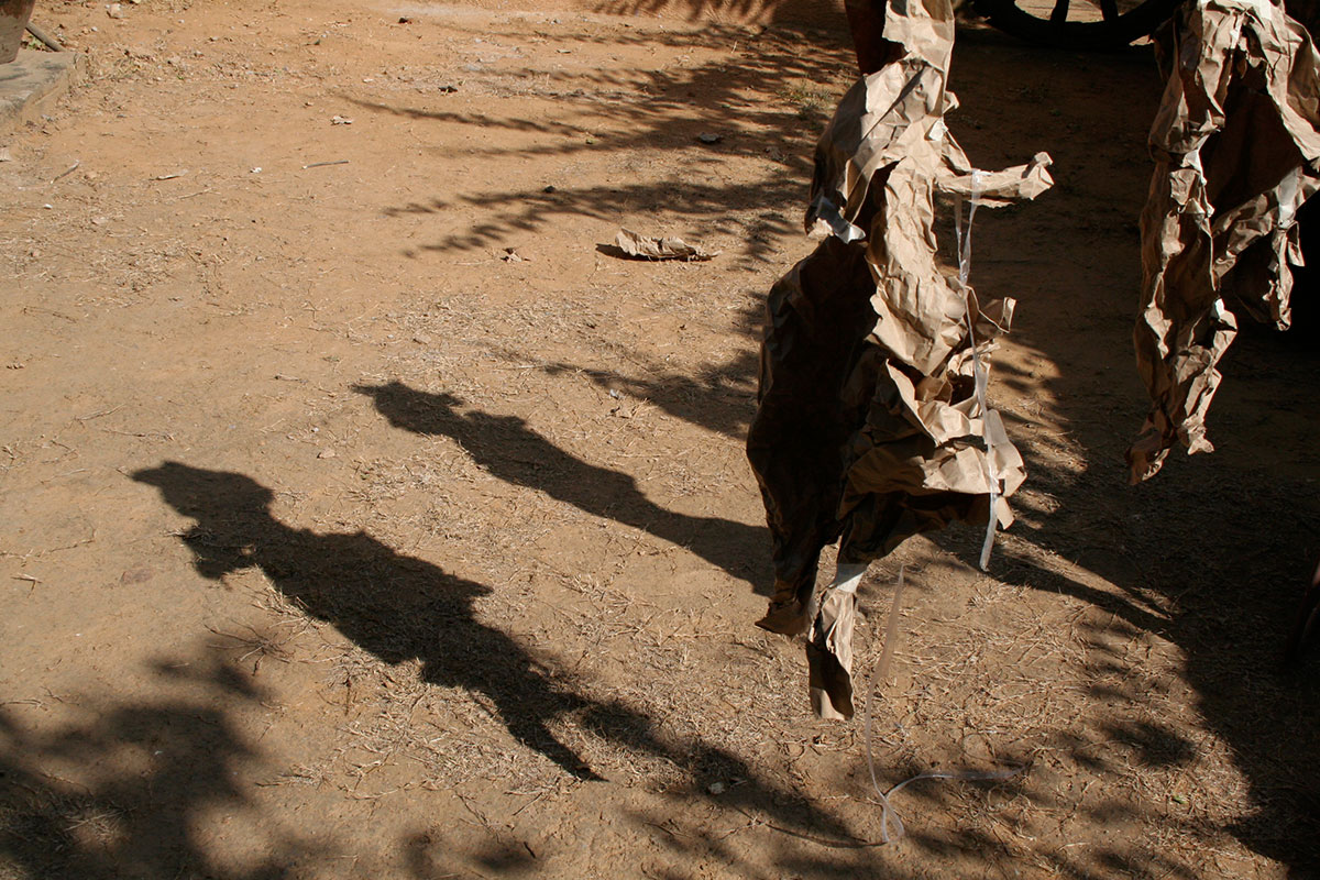 The collaborative dialogue began with the manipulation of brown paper rescued from a burn pile, and hung from string to create recognizable images.