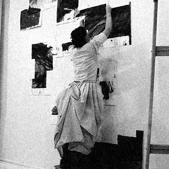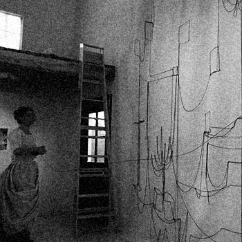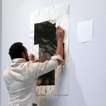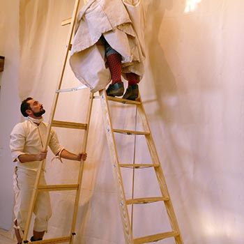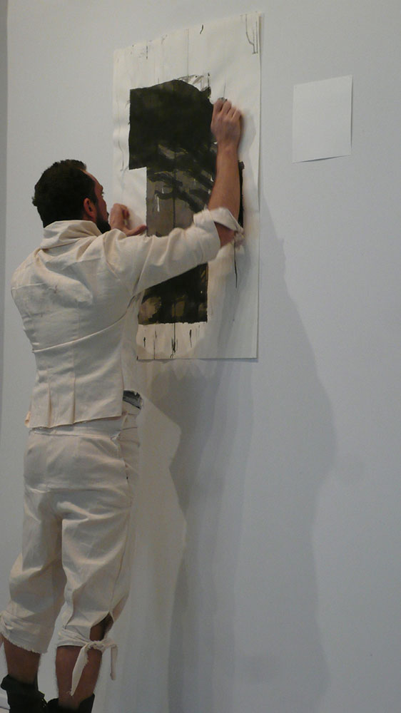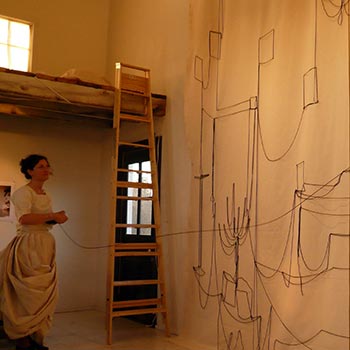 The performance begins with the slow unraveling of a stitched image on giant curtains made from painters’ canvas. The image depicts the interior of a 19th century study. Once the image has been pulled away from the canvas, the curtains are drawn, to reveal a fourteen-foot ink drawing of Haines Falls, a popular subject for the Hudson River school. This image is composed on many sheets of paper, which are slowly dismantled piece by piece. As each piece of paper is taken away, the image begins to fall further and further into abstraction. As the process continues and the entire drawing is dismantled, the audience is exposed to yet another hidden image, a small photograph of the moon. This dramatic series of revelations echo a journey from the interior/micro to the exterior/macro.